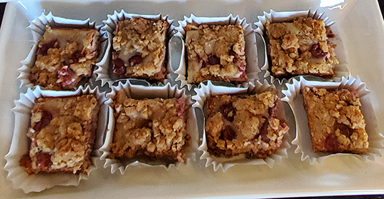 Brown sugar, butter, flour, rolled oats, sugar, orange peel, almond extract, sour cream, eggs, and cherries.